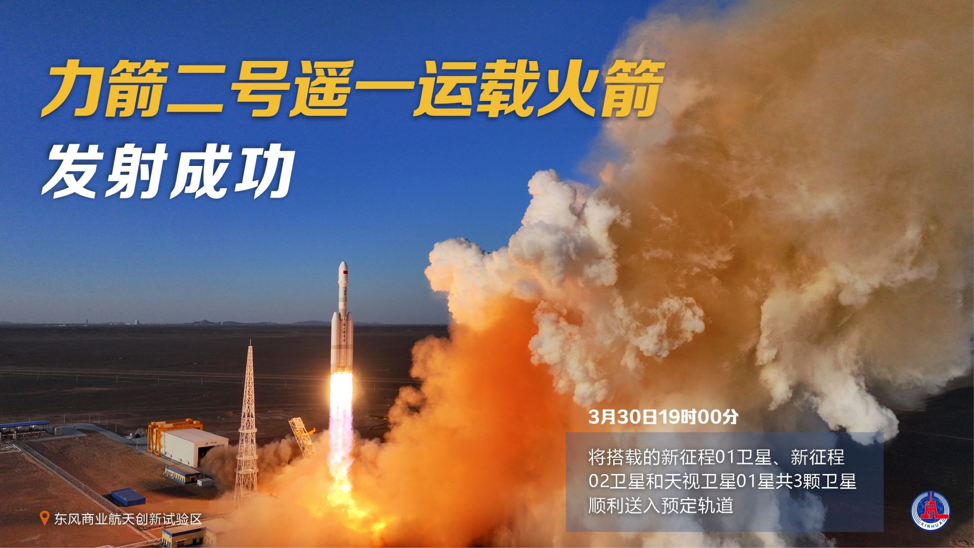 3月30日19时00分,力箭二号遥一运载火箭在东风商业航天创新试验区发射升空,将搭载的新征程01卫星、新征程02卫星和天视卫星01星共3颗卫星顺利送入预定轨道,飞行试验任务取得圆满成功。 新华社发 施鳗珂 汪江波 编制 编辑:李根